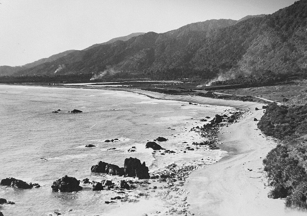 Dredge ponds and the road along the beach - Barrytown flats from the 17 Mile. Pre-1940.