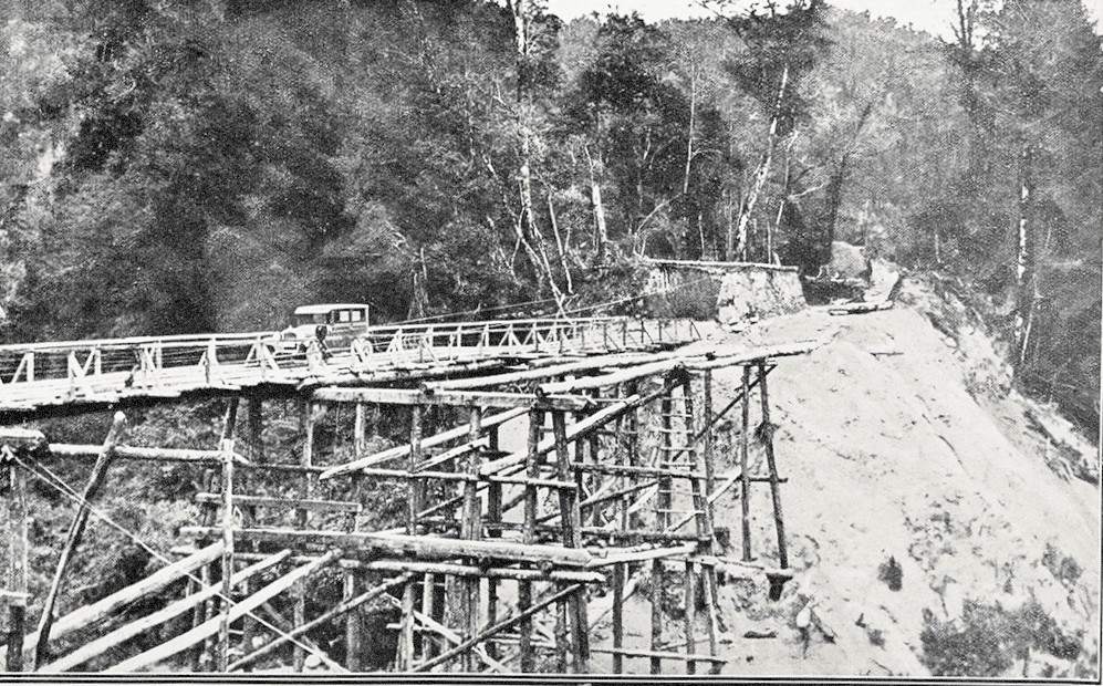 Building a new bridge near Newton Flat , on the road to Lyell.1930.