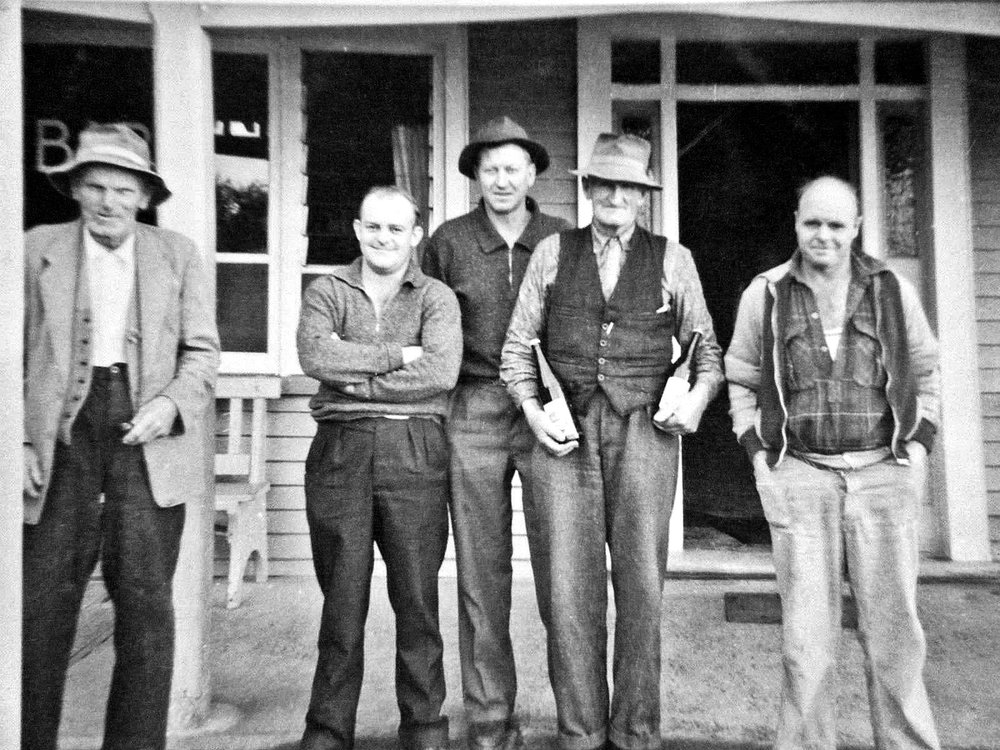 West Coast New Zealand History (21st Apr 2024). Tom Cargill, Bob Blacklock, Andy McTaggart, Stan Olderog, Joey Poole.- outside Barrytown Hotel .1963.. In Website West Coast New Zealand History. Retrieved 4th Apr 2026 07:18, from https://westcoast.recollect.co.nz/nodes/view/156