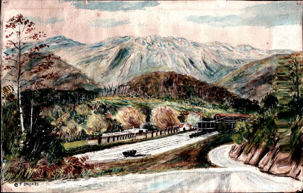 George Lingard painting of Public works camp for road to Charming Creek.1945.