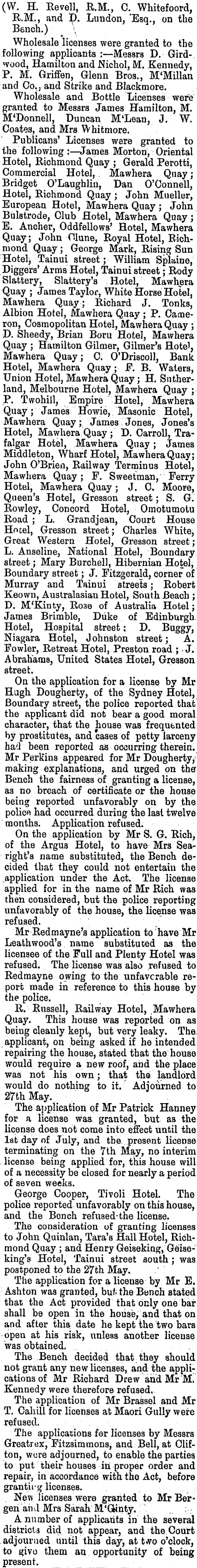 LICENSING COURT, GREYMOUTH. (W. H. Revell, R.M., C. Whiteford, R.M., and D. Lundon, "Esq., on the Bench.) \ Wholesale licenses were granted to the following applicants :— Messrs D. Girdwood, Hamilton and Nichol, M. Kennedy, P. M. Griffen, Glenn Bros., M'Millan and Co., and Strike and Blackmore. Wholesale and Bottle Licenses were granted to Messrs James Hamilton, M. M'Donnell, Duncan M'Lean, J. W. Coates, and Mrs Whitmore. Publicans' Licenses were granted to the following : — James Morton, Oriental Hotel, Richmond Quay ; Gerald Perotti, Commercial Hotel, , Mawhera Quay ; Bridget O'Laughlin, Dan O'Connell, Hotel, Richmond Quay ; John Mueller, European Hotel, Mawhera Quay ; John Bulstrode, Club Hotel, Mawhera Quay; E. Anchor, Oddfellows' Hotel, Mawhera Quay ; John Olune, Royal Hotel, Richmond Quay ; George Mark, Rising Sun Hoteh, Tainui street ; William Splaine, Diggers' Arms Hotel, Tainui street ; Rody Slattery, Slattery's Hotel, Mawhera Quay ; James Taylor, White Horse Hotel, Mawhera Quay ; Richard J. Tonks, Albion Hotel, Mawhera Quay ; P. Cameron, Cosmopolitan Hotel, Mawhera Quay ; D. Sheedy, Brian Boru Hotel, Mawhera Quay ; Hamilton Gilmer, Gilmer's Hotel, Mawhera Quay; C. O'Driscoll, Bank Hotel, Mawhera Quay; F. B. Waters, Union Hotel, Mawhera Quay ; H. Sutherland, Melbourne Hotel, Mawhera Quay ; P. Twohill, Empire Hotel, Mawhera Quay ; James Howie, Masonic Hotel, Mawhera Quay; James Jones, Jones's Hotel, Mawhera Quay; D. Carroll, Trafalgar Hotel, Mawhera Quay ; James Middleton, Wharf Hotel/ Mawhera Quay; I John O'Brien, Railway Terminus Hotel, Mawhera Quay; F. Sweetman, Ferry Hotel, Mawhera Quay ; J. C» Moore, Queen's Hotel, Gresson street ; S. G. Rowley, Concord Hotel, Omotumotu Road ; L. Grandjean, Court House Hotel, Gresson street; Charles White, Great Western Hotel, Gresson street; L. Anseline, National Hotel, Boundary street ; Mary Burchell, Hibernian Hotel, . Boundary street ; J. Fitzgerald, corner of Murray and Tainui streets ; Robert Keown, Australasian Hotel, South Beach ; D. M'Kinty, Ro3e of Australia Hotel; James Brimble, Duke of Edinburgh. Hotel, Hospital street ; D. Buggy, Niagara Hotel, Johnston street; A. Fowler, Retreat Hotel, Preston road ; - J. Abrahams, United States Hotel, Gresson street. On the application for a license by Mr Hugh Dougherty, of the Sydney Hotel, Boundary street, the police reported that the applicant did not bear a good moral character, that the house was frequented by prostitutes, and cases of petty larceny had been reported as occurring therein. Mr Perliins appeared for Mr Dougherty, making explanations, and urged on the Bench the fairness of granting a license, as no breach of certificate or the house being reported unfavorably on by the police had occurred during the last twelve months. Application refused. On the application by Mr S. G. Rich, of the Argus Hotel, to have Mrs Searight's name substituted, the Bench decided that they could not entertain the application under the Act. The license applied for in the name of Mr Rich was then considered, but the police reporting unfavorably of the house, the license was refused. Mr Redmayne's application to have Mr Leath wood's name substituted as the licensee of the Full and Plenty Hotel was refused. The license was also refused to Red may ne owing to the unfavorable report made in reference to this house by the police. R. Russell, Railway Hotel, Mawhera Quay. This house was reported on as being cleanly kept, but very leaky. The. applicant, on being asked if he intended repairing the house, stated that the; house would require a new roof, and the place was not his own; that the landlord would do nothing to it. Adjourned to 27th May. The application of Mr Patrick Hanney for a license was. granted, but as the license does not come into effect until the Ist day of July, and the. present license terminating on the 7th May, no interim license being applied for, this house will of a necessity be closed for nearly a period of seven weeks. George Cooper, Tivoli Hotel. The police reported unfavorably on this house, and the Bench refused- the license. The consideration of granting licenses to John Quinlan, Tara's Hall Hotel, Richmond Quay ; and Henry Geiseking, Geiseking's Hotel, Tainui street south ; was postponed to the 27th May. The application for a license by Mr E. Ashton was granted, buf; the Bench Btated that the Act provided that only one bar shall be open in the house, and that on and after this, date he kept the two bars open at his risk, unless another license "was obtained. , The Bench decided that they should not grant any new licenses, and the applications of Mr Richard Drew and Mr M. Kennedy were therefore refused. The application of Mr Brassel and Mr T. Cahill for licenses at Maori Gully were refused. The applications for licenses by Messrs Greatrex, Fitzsimmons, and Bell, at Clifton, were adjourned, to enable the parties to put their houses in proper order and repair, in accordance with the Act, before granting licenses. a . New licenses were granted to Mr Bergenah Mrs Sarah M'Ginty A number of applicants in the several districts did not appear, and the. Court adjourned until this day, at two o'clock, to give them an opportunity of being present. ■