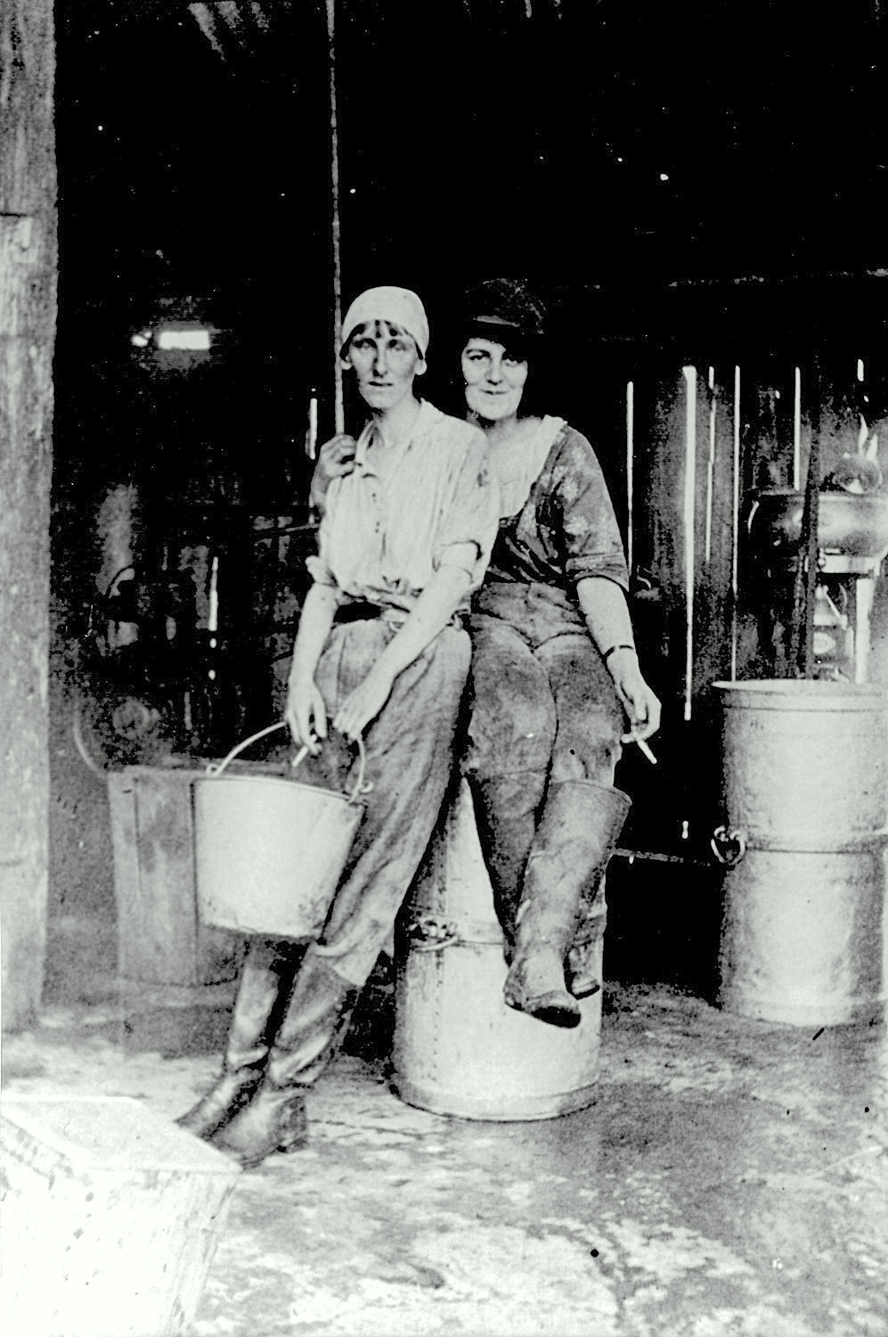 Dorothy Bogle and Margaret Vincent in Northcrofts milking shed, Whataroa 1923.