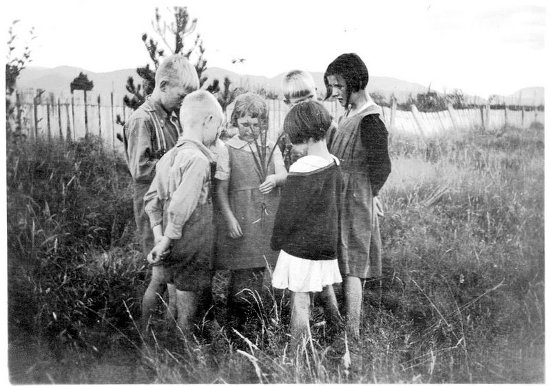 Fred Watts, Jim Watts, Sid Watts, Irene Paterson,Lily and Rennie Mc`George - Rotokohu School nature study - 1930`s.