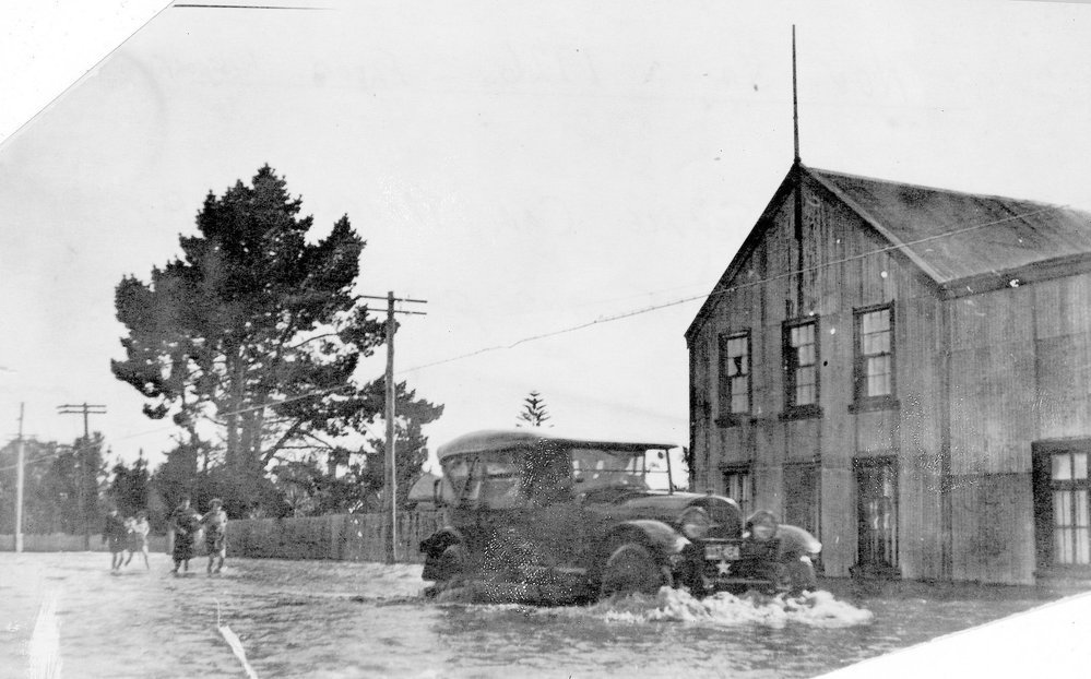 Newmans service car passing Nahrs Brewery, Westport flood 1926.