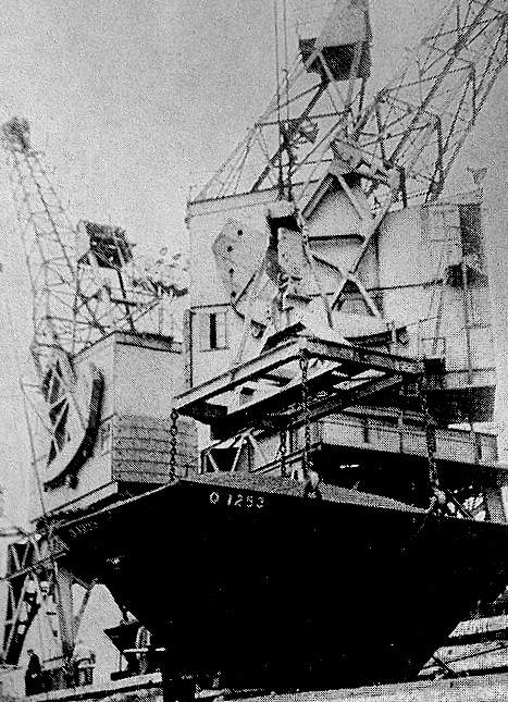 An 8 ton coal hopper being loaded by an electric crane, Greymouth. 1950s.