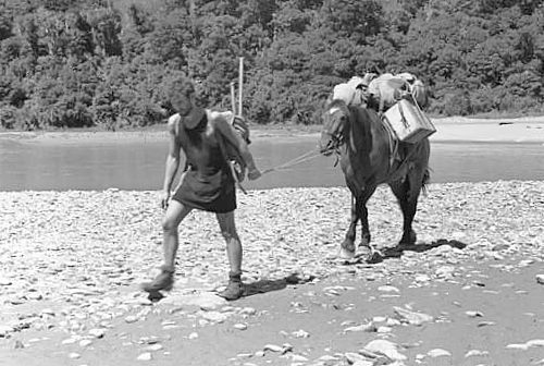 A young Fred Hollows helps bring supplies up the Waiatoto River 1953.