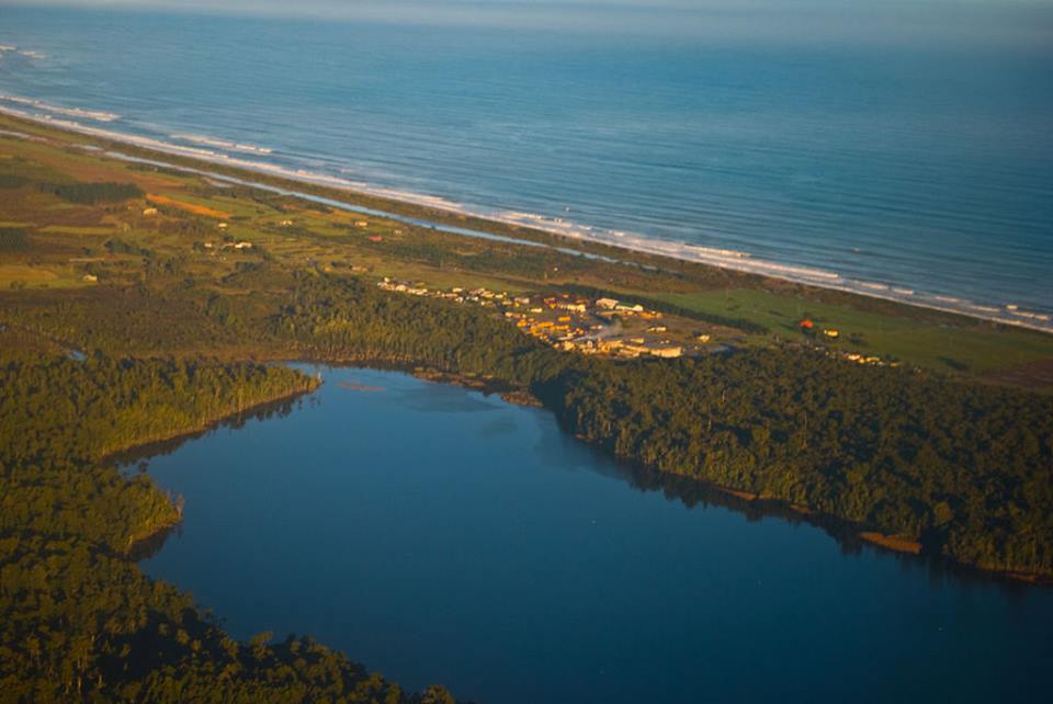 The town's name stems from Ruatapu, a figure in Maori mythology. The town is located on a narrow strip of land between the Tasman Sea and Lake Mahinapua, a shallow lake that was originally a coastal lagoon.