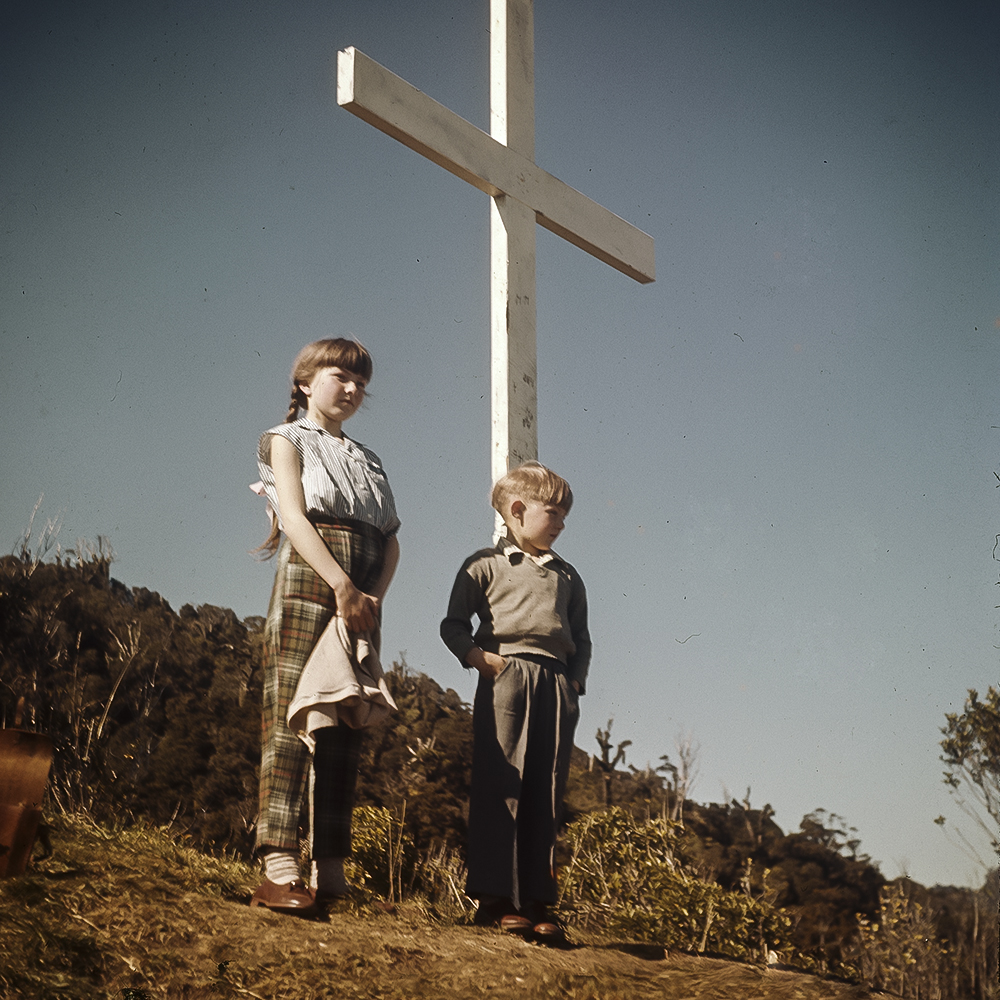 Tim Mora.."The current cross is in fact the seventh or possibly 8th cross installed on the Hill. As far as I can determine this is what happened. On Feb 14th 1944 a first Presbyterian service was held in Cobden and then on 11th March 1945 the foundation stone was laid for St Andrews Presbyterian church in Fox Street by Mr T.C. Brash moderator for the Presbyterian General Assembly where the current Scenicland preschool is. Steve Crestani moved the Foundation Stone when he built the accessible access ramp into the Pre School in 2001. It would have been hidden underneath the ramp otherwise. He set it back up in concrete in the front garden to the right of the entrance path. Rev T.G. Campbell was the minister. At either the first service or foundation stone laying a group went up the hill and installed a cross. The poem by Ozzie Eastwood was written to commemorate that event. I am not sure who installed it. In 1957 when Sister Sylvia Jenkins arrived that cross was in disrepair either through time or vandalism. Inspired by Ozzie's poem she in 1959 when the Bible classes of Westland-Buller presbytery were in Greymouth for a District rally at Easter she mobilised them to go up the hill and re-erect the original cross. After 15 years of wear and tear and vandalism the original cross was in pretty poor condition and so they replaced it with a new one that they concreted in place. The following year 1960 the Dominion Bible Class conference led a pilgrimage up there (see photo below). This is the second cross. Then in 1965/66 the cross has appeared to have fallen into disrepair again and a small group of presbyterian youth including Jean Rodgers and from the left Len McGrane, Tony Rodgers, Andrew Tulloch, Michael Rodgers, Keith Baty and Murray Baty carried up a replacement and installed it. You'll notice this one is not rebated like the previous one. This is the third cross. The 1982 photo of the cross there is a lot of bush behind it and a very graffitted upright with a strip of something nailed to the front. This could be a different cross again potentially the fourth or potentially a worse for wear 1965 one. In the 1988 photo of current mayor Tania Gibson as a child at the cross it is a cleared site and a rebated cross again and not flush with the back, so assuming there was a fourth already, this then becomes the 5th cross put in after the 1982 version and before the 1990 one. The cross fell into disrepair again and was knocked over in a storm and in 1990 Peter Anderson, Peter Bezine, Phil Costigan and Fred Heine constructed a new cross and it was airlifted to the site by helicopter Chris Cowan and concreted in. Over the next couple of years (2013-5) Dr Ian Petersen looked after it before heading over to Australia. Towards the beginning of the year (2015) Ross Maryatt and Peter Andersen returned to the site and cleared it and installed a solar powered light that comes on at certain times some evenings. This is the sixth cross. In 2018 someone cut down the cross and then cut off the arms. No one knows who it was or why but on Easter Good Friday 30th March 2018 Hugh and Fainga Barrow, Tim Mora, Peter Anderson, Benji Roper, Daniel Lowe and Jess Lowe and her friend Willow went up and installed a new cross. It had been fabricated by E Quip and was galvanised steel painted white with a wooden cross piece protected on the edges with steel strips. It was helicoptered into place by Ahaura helicopters and the team went up and put it together and bolted it onto the wooden stump of the previous cross. On Easter Monday a team went back up and put some concrete reinforcing around it and there is a solar light installed on top. This is the seventh cross. In Oct 2021 some unknow vandals took to the cross with a battery powered angle grinder curring it half through and pushing it over. During the week on Thursday leading up to Sat the 18th of Dec 2021 Ahaura Helicopters placed the new upright for the cross along with some cement and water on the Cross hill top. Then on Saturday at 2pm Archdeacon Tim Mora, Stewart Nimmo, Henk Stengs, Peter Anderson Daniel Lowe, Juulian Grimmshaw and Graeme Vincent went up the hill taking with them a range of tools along with the solar panel and light. It took 2 and half hours to assemble the new cross, lift it into place and concrete the base. This is the seventh or eighth Cross to be installed on the hill replacing those that had fallen into disrepair because of age or materials and more recently vandalism. A huge thank you to Lee Swinburn at Equip, Simon at Ahaura Helicopters and Edie Gray at Brightwater Engineering and others who donated finances or discounted equipment. The solar light was also reinstated but tended to blow out the cross shape. About a year later Peter Anderson lifted the light higher and altered the angle and now it gives a cross shape at night.PhotographerLloyd JonesDate of Photo1961.Map[1] ContributorPeta Jones