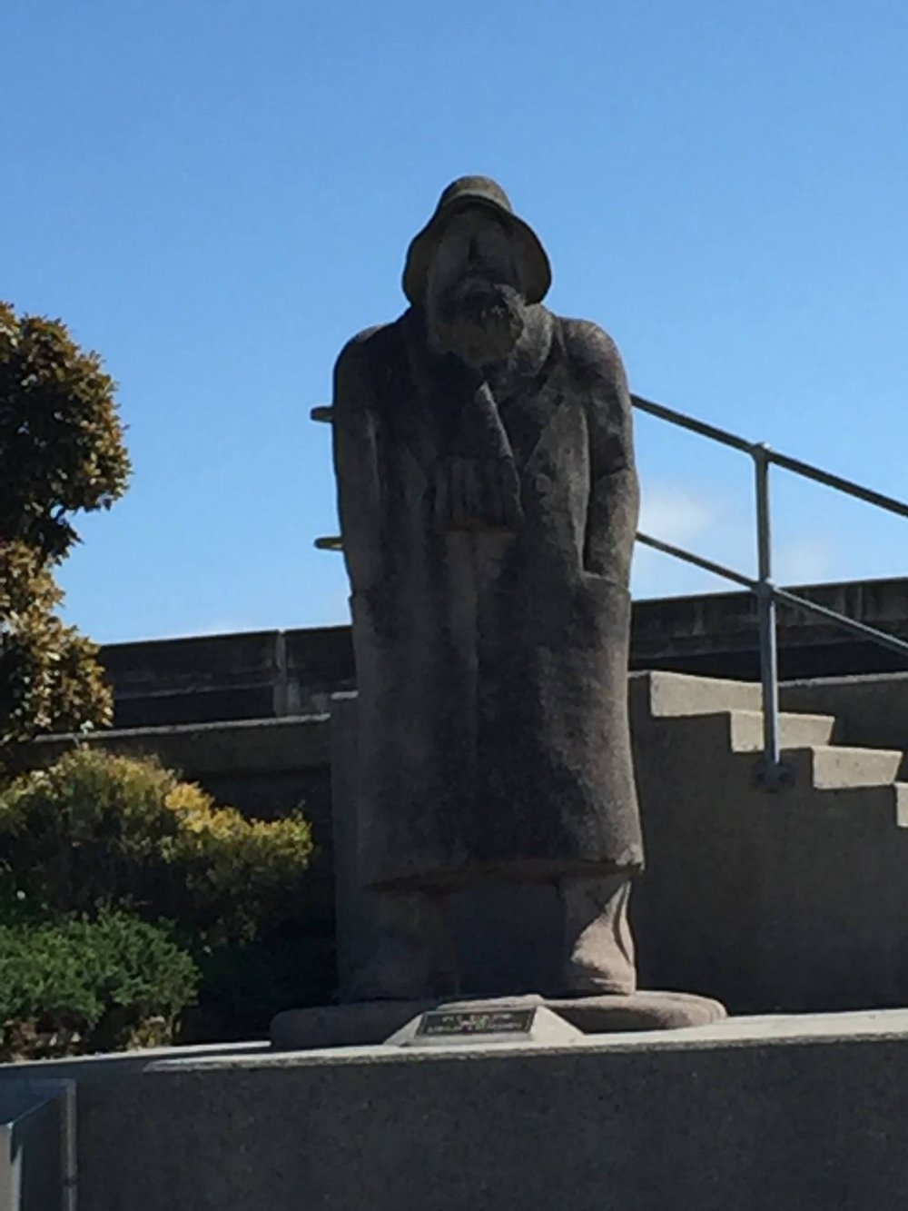 James Newby Steve Newby carved it as well as the Dolpin further down the floodwall and also the statue at the brunner mine site.