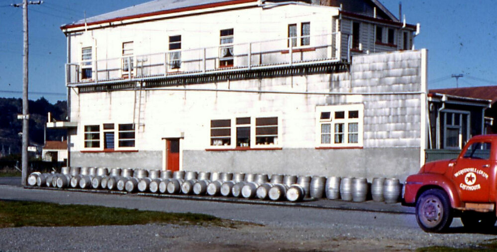 DescriptionThe Recreation Hotel Greymouth..early 1960s. We lived opposite the Rec in Buccleugh Street and my father George took this photo. He was a member of the Greymouth Camera Club and he entered this photo in one of their competitions with the title.."the Pub with no Beer"...in the early 60's wooden barrels were replaced with aluminium barrels.