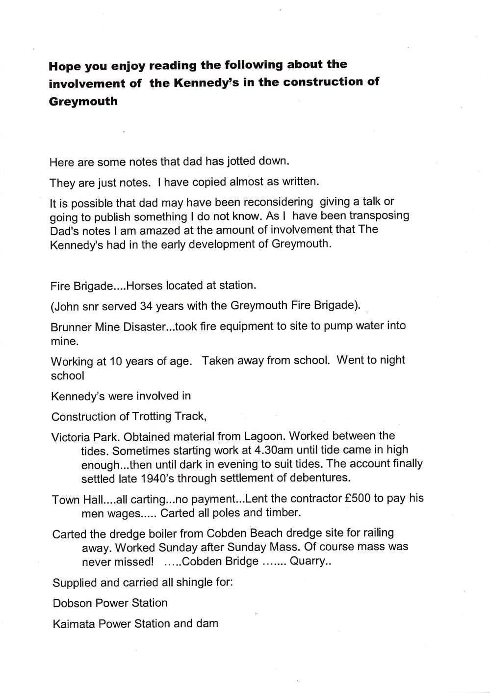 Involvement of The Kennedys in the construction of Greymouth . -2 PAGES-