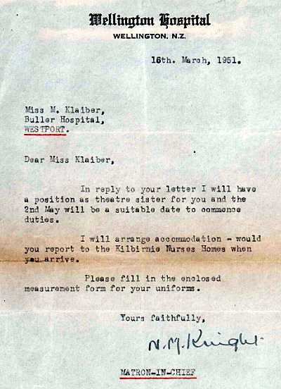 Letter to Miss Klaiber a nurse at Buller Hospital, Westport, 16th March 1951.