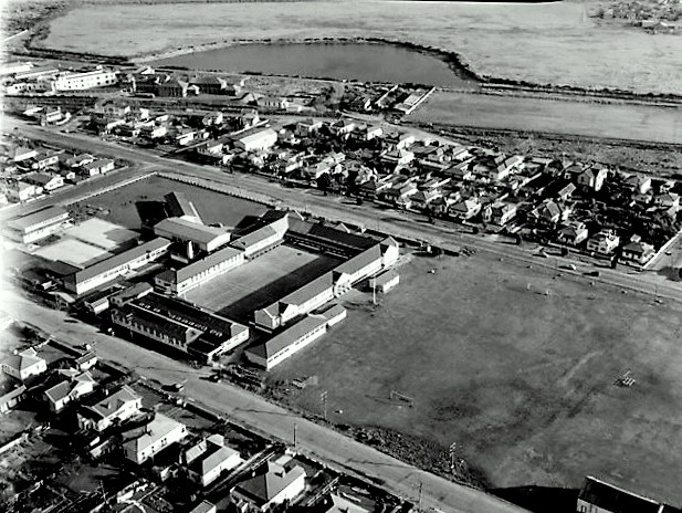Greymouth - showing Greymouth High School buildings and Shakespeare and High Streets. 1958