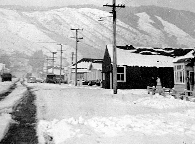 Corner of Shiel and Sinnamon Sts, Reefton, during the 1961 snow.