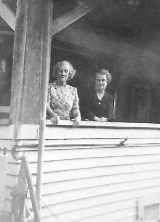 Cecilia Morris left and Sarah Morris on the verandah Maruia Springs Hotel.1944. 1944
