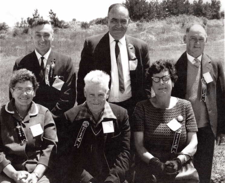 DescriptionThe Hibbs family at the Camerons School Jubliee Reunion in 1968. From back row left: William Merle Hibbs, Tom Douglas Hibbs, Claude Edgar Hibbs, front row: Alice Dorothy Johnson (nee Hibbs), Gordon Henry Hibbs, and Rita Jane Nelson (nee Hibbs).