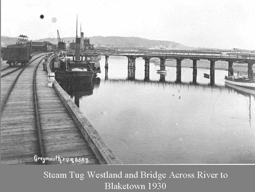West Coast New Zealand History (14th Sep 2019). The steam tug Westland and the bridge across to Blaketown, 1930. In Website West Coast New Zealand History. Retrieved 28th Apr 2026 05:26, from https://westcoast.recollect.co.nz/nodes/view/26053