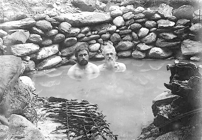 Jack Adamson and Tommy Law soaking in a hot pool,Waiho, Franz Josef.ca.1897.