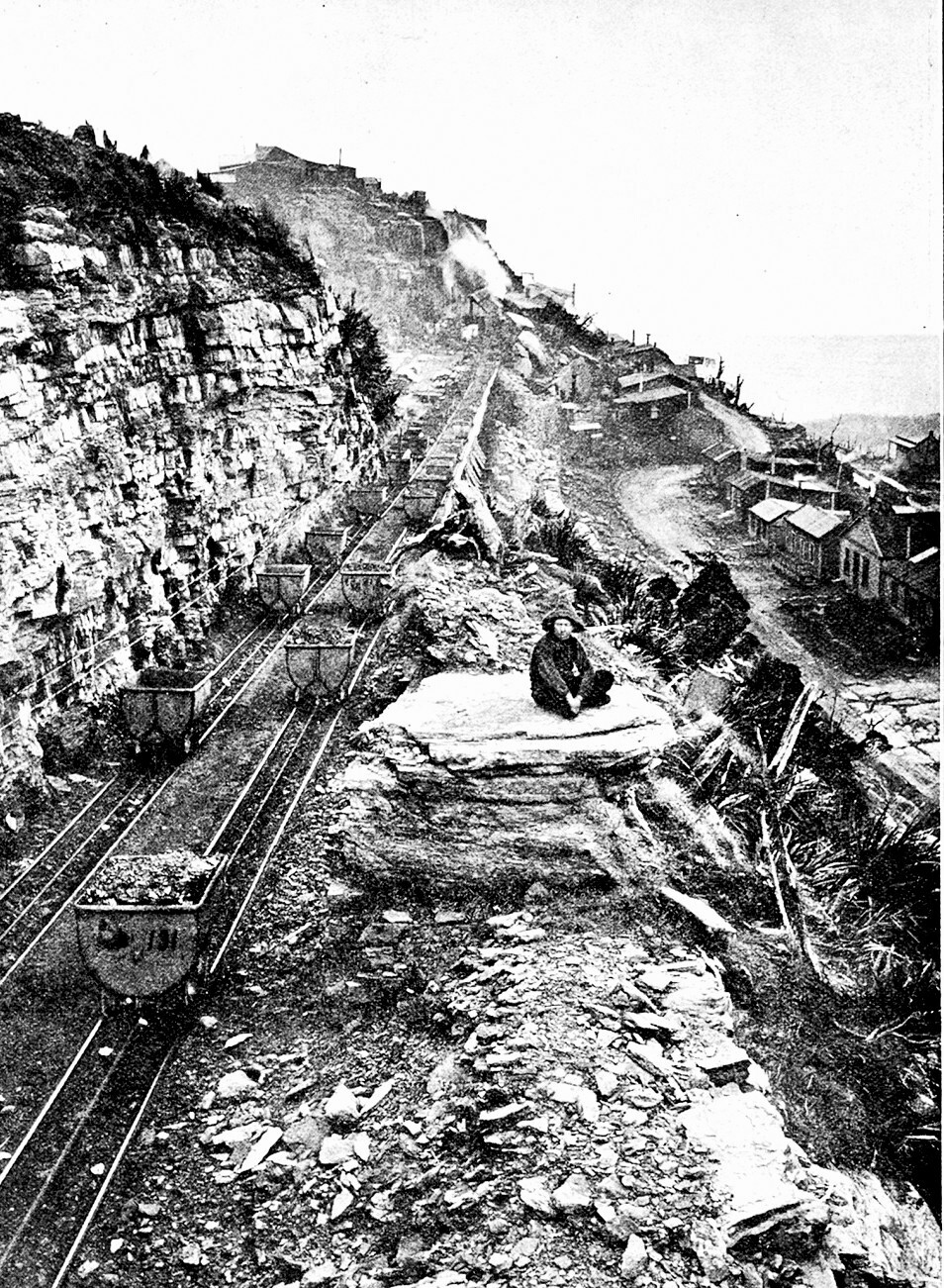 Trucks on the way to and from the bins at the head of the incline,Denniston Mine.ca.1910
