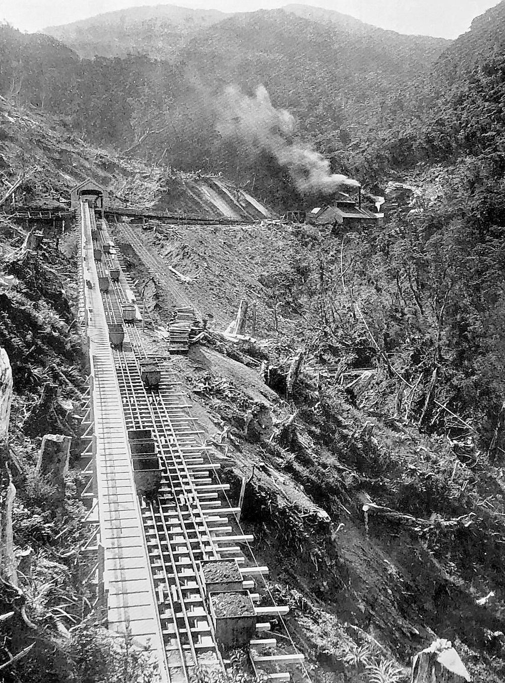 Ken Campbell Crow Bay I don’t know when this was but it must be very early days. Looking up to the covered area where the boxes were attached to the rope it goes to the right . From there the rope went towards the creek and across another viaduct ( not seen in this picture) to the no 2 mine. I always thought there was a line up the side of the creek to Siberia. The miners hoist passed under the viaduct seen in this picture where the men came through the tunnel from the station to the mine. I doubt that had been built at this stage. At the top of this picture there is no bathhouse lamp house weigh bridge or cabins that people lived in . I’m pretty sure there was another power house a little further down the hill later on . Also no rope bosses hut or rope boys hut so maybe the no 2 mine was not yet started.