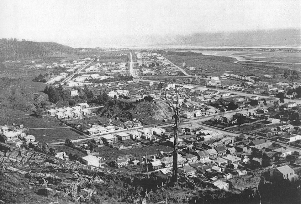 Malcolm Howell. You can see the original Grey Main School in Tainui Street. It was gone by the mid 1920s. The five houses shown on the town side of Murray Street were built in 1880s. Going by the striped painting of the house verandas my guess is the early 1900s.