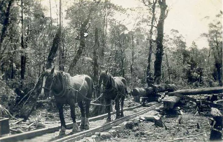 Horses transporting timber to Inangahua Sawmill,Hard Creek.