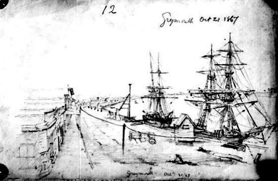 Barnicoat sketch of sailing ships moored at Greymouth, Oct 21, 1867
