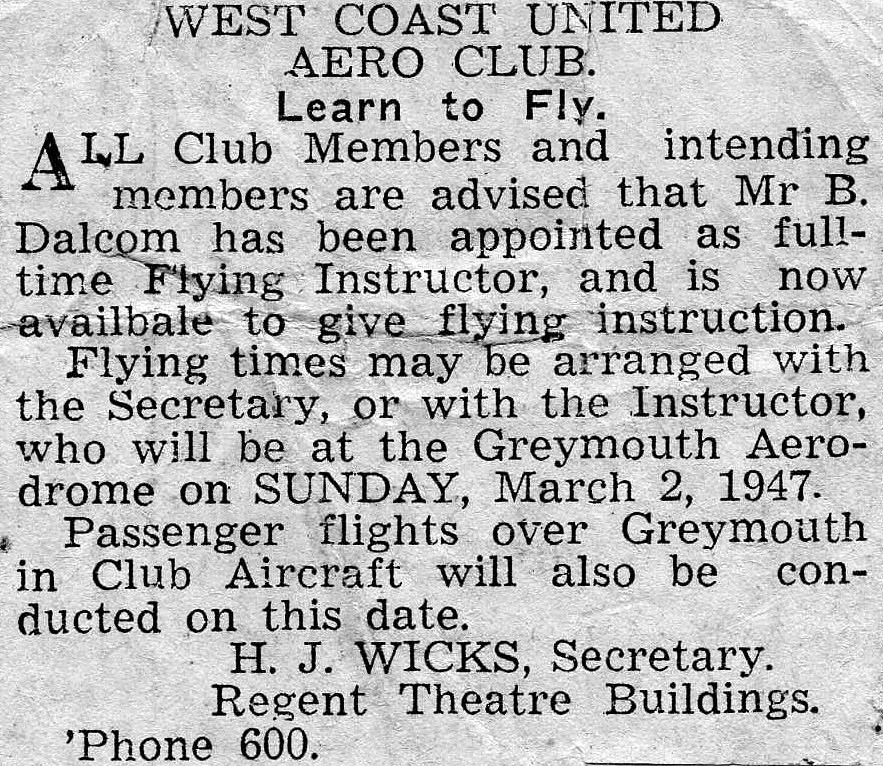 West Coast New Zealand History (31st Dec 2019). West Coast United Aero Club - Learn to fly. 1947.. In Website West Coast New Zealand History. Retrieved 26th Apr 2026 07:56, from https://westcoast.recollect.co.nz/nodes/view/26744