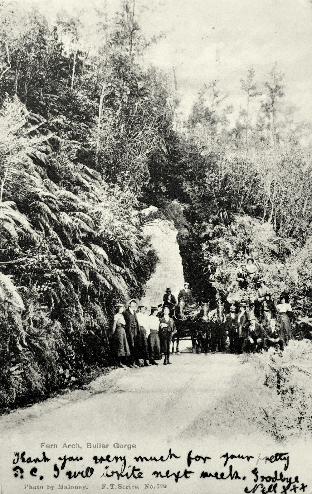 West Coast New Zealand History (19th Aug 2022). Postcard of Fern Arch in the Buller Gorge, dated 1906. In Website West Coast New Zealand History. Retrieved 5th Apr 2026 11:27, from https://westcoast.recollect.co.nz/nodes/view/26846