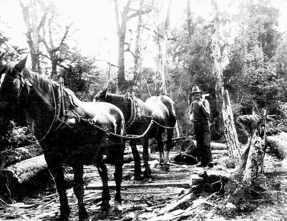 'Bonnie' & 'Maggie' being worked by Fred Tuck near Big Bridge, near the old Nelson Creek crossing - Drennans Road, or Gows Creek Road.1929.