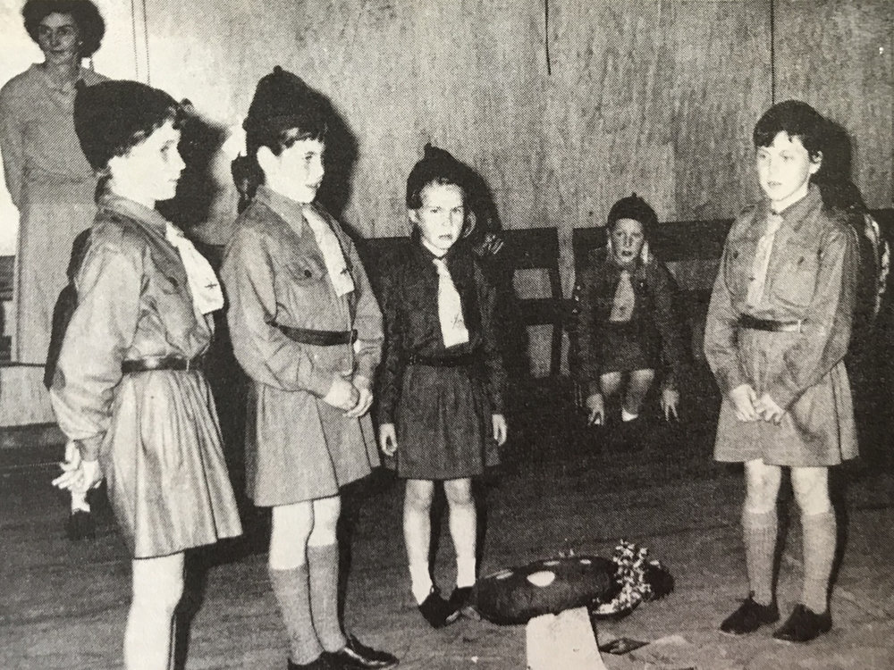 Johnella Bird, Karen Jacobs and Shelley Jacobs being enrolled in the second Greymouth Brownies Pack.1960.
