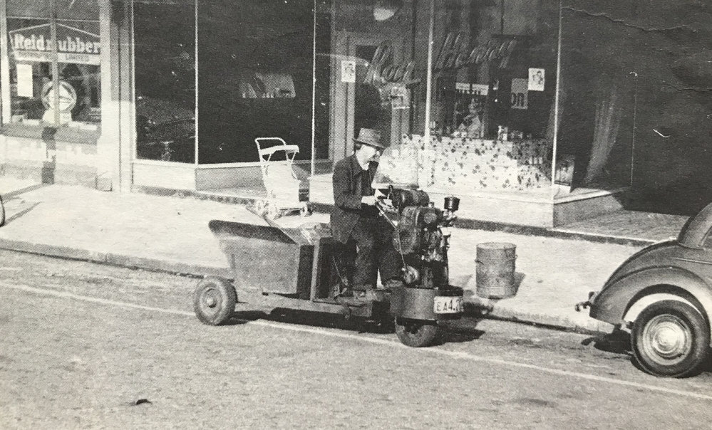 Nicol (Nicky) Paton on his street cleaning scooter, Greymouth *ALAN WISDOM COLLECTION*