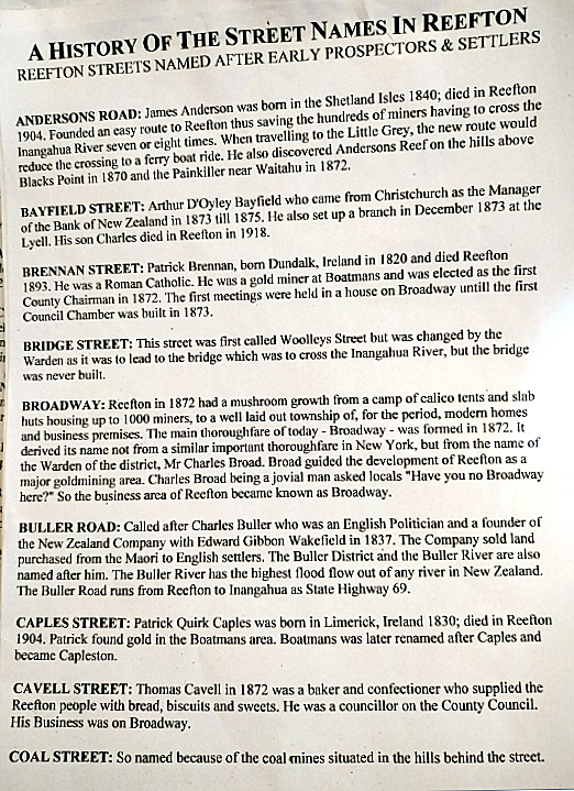 West Coast New Zealand History (5th Jun 2022). A history of the street names in Reefton.. In Website West Coast New Zealand History. Retrieved 24th Apr 2026 23:41, from https://westcoast.recollect.co.nz/nodes/view/27261
