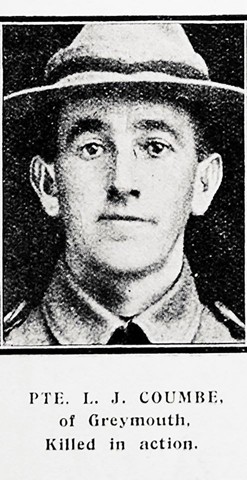 Obituary in the Grey River Argus 20 July 1917: It is our painful duty to record the death of another brave lad in the person of Private Lou Coumbe, the second son of Mrs Coumbe, of Greymouth, in the service of his King and country. The late Private Coumbe left Greymouth with the 4th Reinforcements, and had been two and a half years actively engaged in the front line. He went through the Gallipoli campaign and the Battle of the Somme without a scratch, and at the time of his death was evidently preparing for a visit to England on leave, as the day before he was killed the family received a cable from him to forward L10. This young soldier was a fine specimen of manhood, and was employed at Grant’s sawmill at Mardsen. He was keen to respond to the call of the Empire. The widowed mother, who received more than a fair share of grief during the last few years, will have the whole-hearted sympathy of this community; but this can hardly heal the terrible wound this world war has inflicted on her beloved home.”