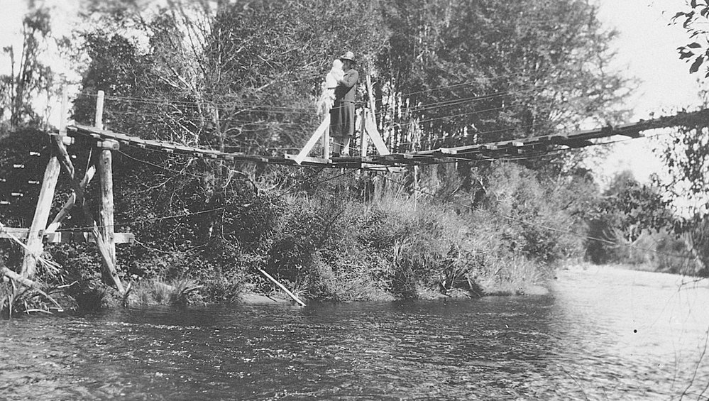 West Coast New Zealand History (28th Dec 2022). Anna Lucas crossing swing bridge to the lookout at Deep Creek , Kotuku.. In Website West Coast New Zealand History. Retrieved 22nd Apr 2026 08:09, from https://westcoast.recollect.co.nz/nodes/view/27484