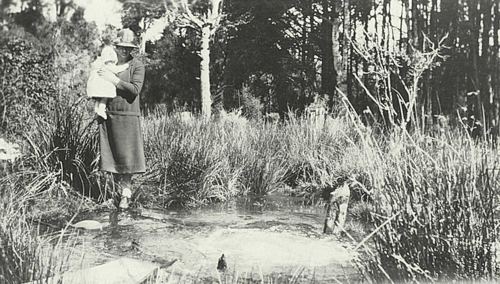 Anna Lucas carrying Hazel Lucas standing by a soda Spring , Kotuku - .1926-27.