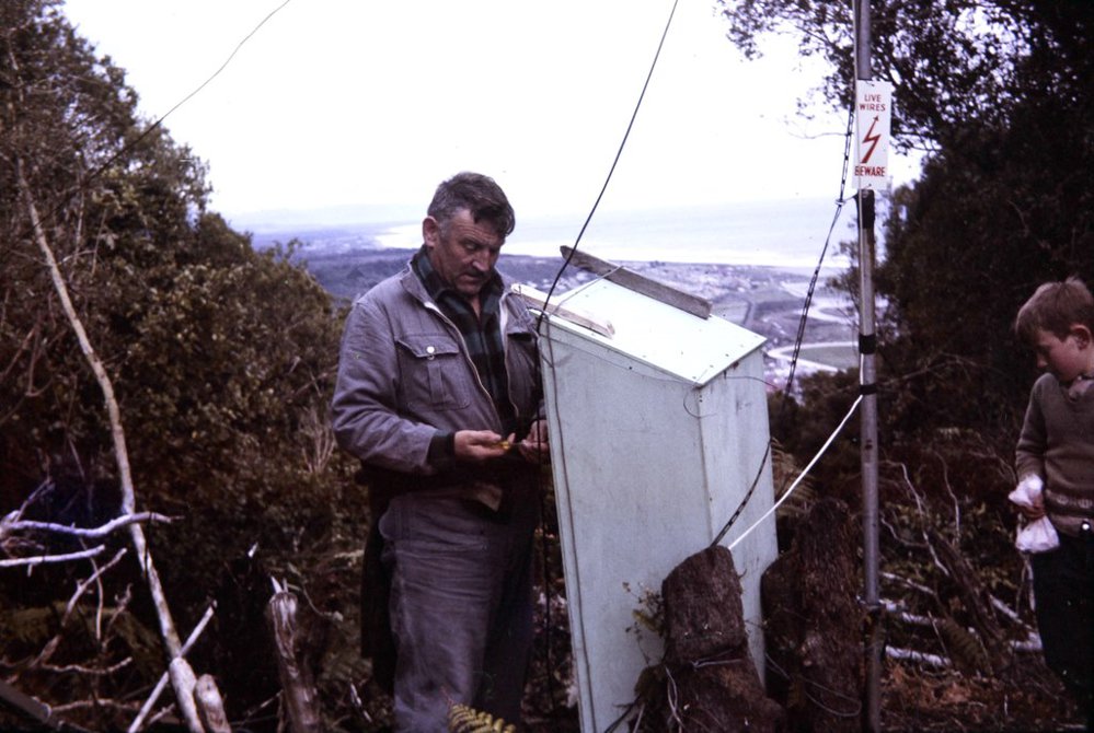 Max Farrell working on the lower translator on Cobden Hill with assistance from Peter Farrell age 8. The lower translator was installed to receive a TV signal from the Cobb translator on the wharf at Hokitika which had become the only location with a strong enough signal when NZBC moved their transmitter from ChCh city centre to Marley Hill transmitter on the Port Hills. The originally selected direct relay from Christchurch via a bounce off a rock face on Mt Alexander was lost and a Plan B was needed. That plan was found when a strong enough signal from Hokitika was identified. The relay from Christchurch to Hokitika to Cobden Hill lower and then to Cobden Hill upper translator went through 4 channel changes before being broadcast up and down the valley. It was the longest successful TV translation relay in the Southern Hemisphere at the time. It wasn't perfect but it worked.Map[1]