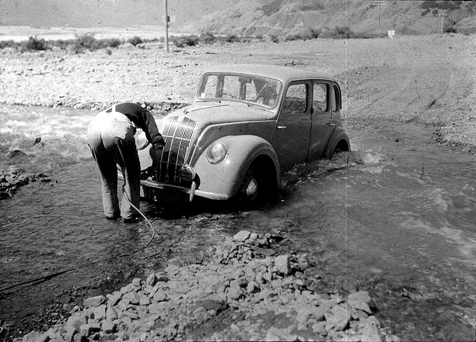 A Morris car is stuck in the ford across Broad Stream, near Bealey Spur, in 1948.