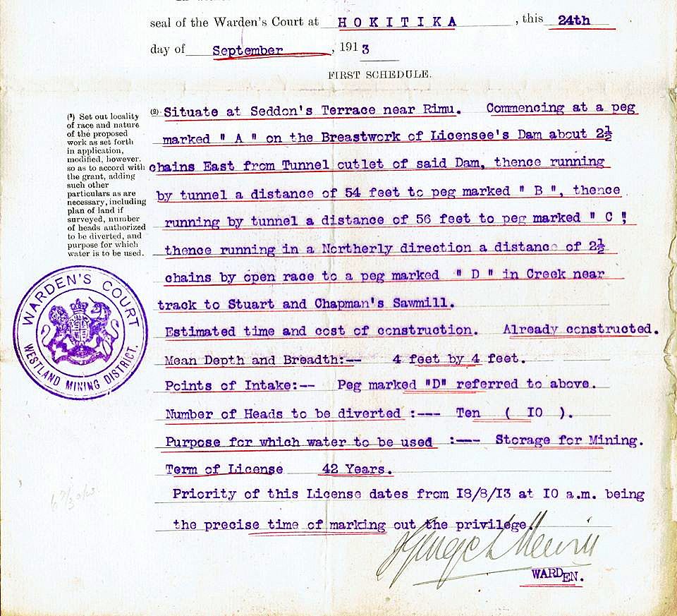 West Coast New Zealand History (21st Jan 2025). Water-Race License document showing a Westland Mining District Warden's Court stamp.1913.. In Website West Coast New Zealand History. Retrieved 19th Apr 2026 06:04, from https://westcoast.recollect.co.nz/nodes/view/27938