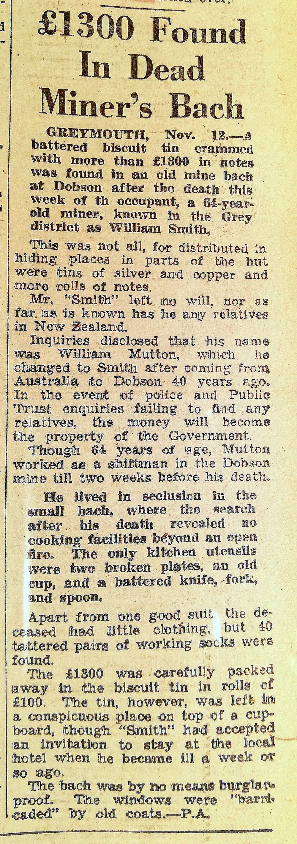 West Coast New Zealand History (19th Apr 2025). 1,300 pounds found in deceased Miner`s bach, Dobson.1949.. In Website West Coast New Zealand History. Retrieved 19th Apr 2026 04:24, from https://westcoast.recollect.co.nz/nodes/view/27972