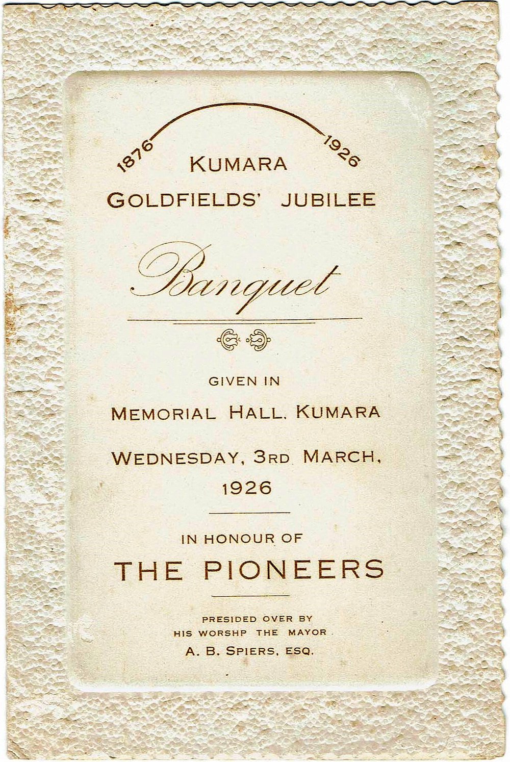 Banquet card from Kumara Goldfeilds Jubilee.1926. - 2 PHOTOS -