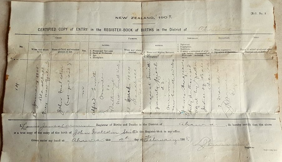 West Coast New Zealand History (8th Jul 2020). Alf Smiths father`s birth certificate, Ahaura. 1905.. In Website West Coast New Zealand History. Retrieved 14th Apr 2026 14:14, from https://westcoast.recollect.co.nz/nodes/view/28075