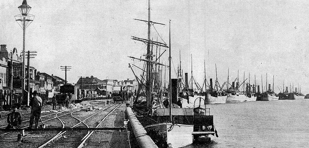 Fourteen Steamers and a Sailing Vessel docked together in Greymouth. 1911