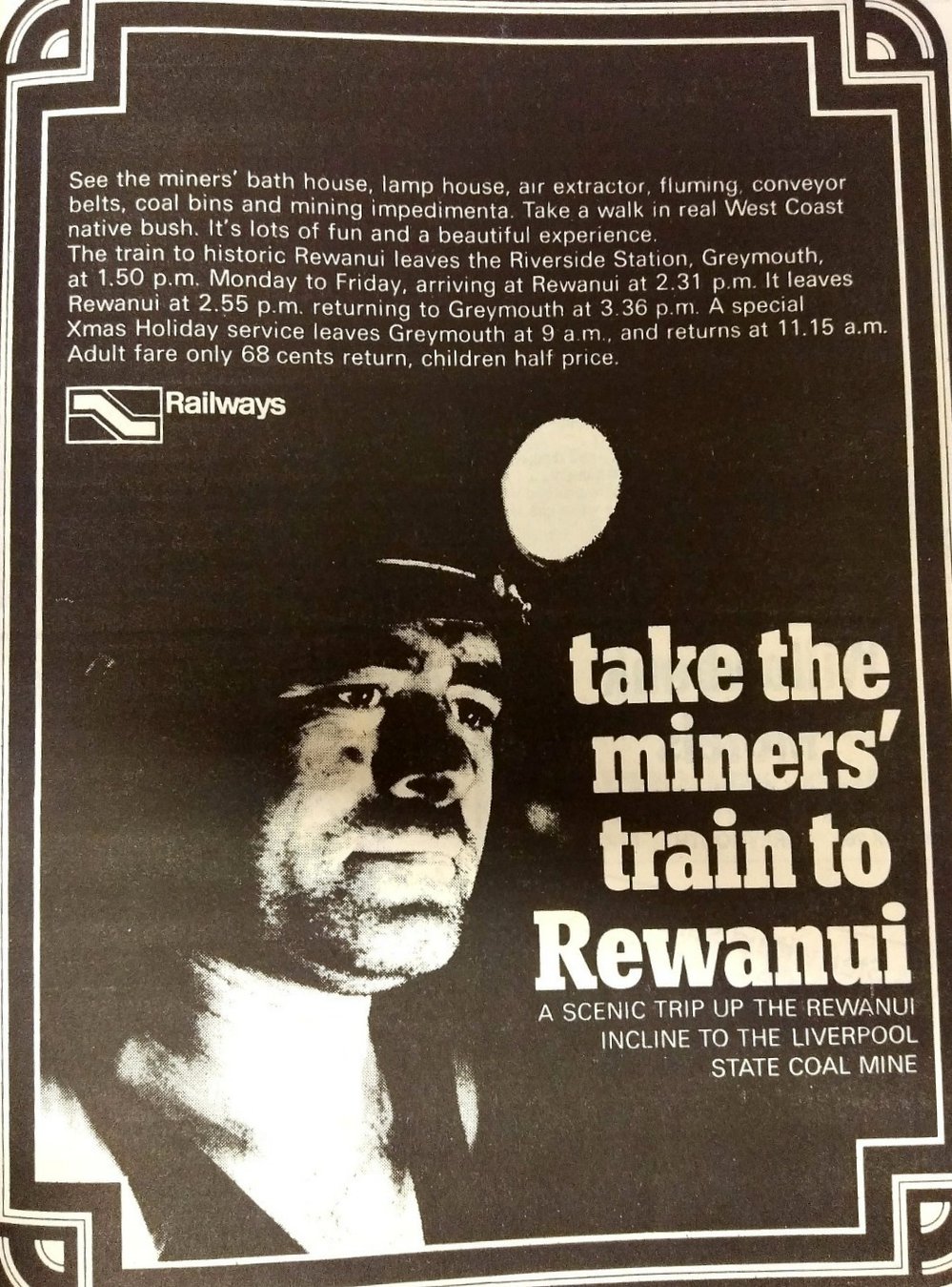 West Coast New Zealand History (10th Jun 2021). "Take the Miners` Train to Rewanui " - advertisement. 1974.. In Website West Coast New Zealand History. Retrieved 14th Apr 2026 14:13, from https://westcoast.recollect.co.nz/nodes/view/28078