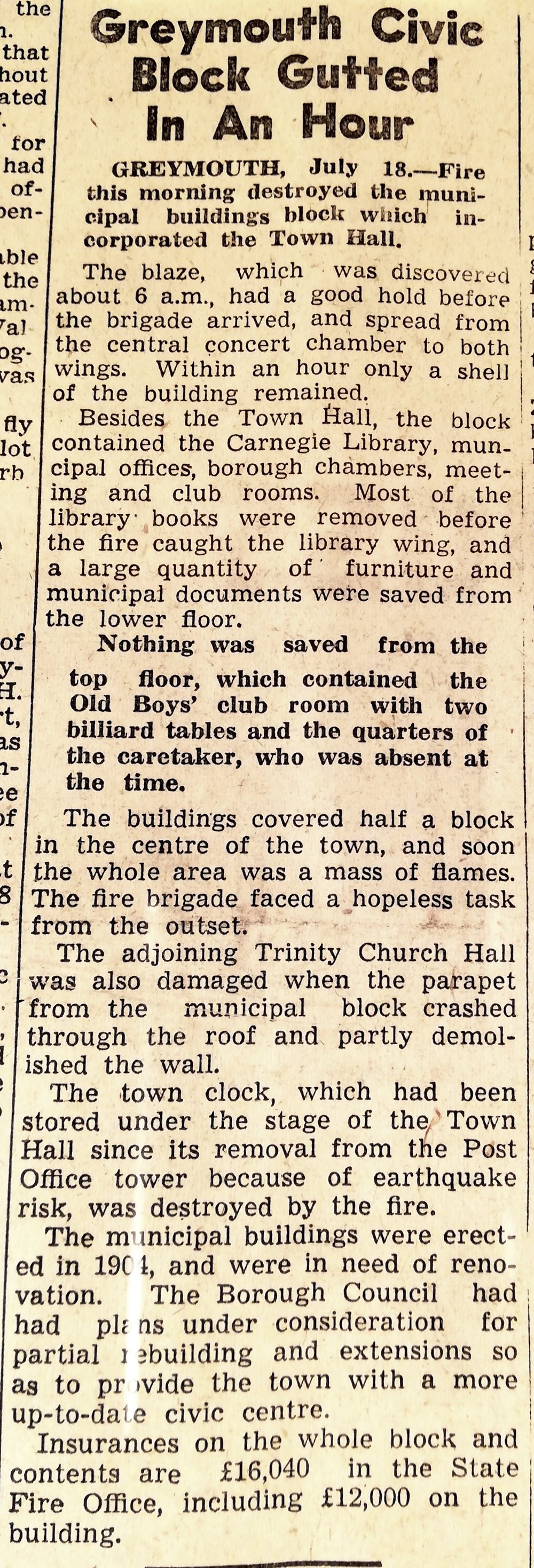 West Coast New Zealand History (7th Sep 2020). Municipal Buildings block-Town Hall Fire, Greymouth. July 18th,1947.. In Website West Coast New Zealand History. Retrieved 13th Apr 2026 16:26, from https://westcoast.recollect.co.nz/nodes/view/28397
