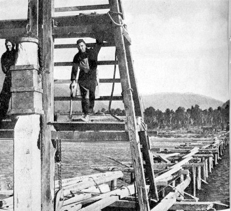 Building a bridge across the Mahitahi River, 3 miles south of Bruce Bay. 1938.