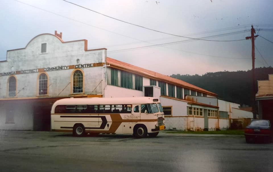 Wyldes bus outside the Runanga District Community Centre.early 1980`s.