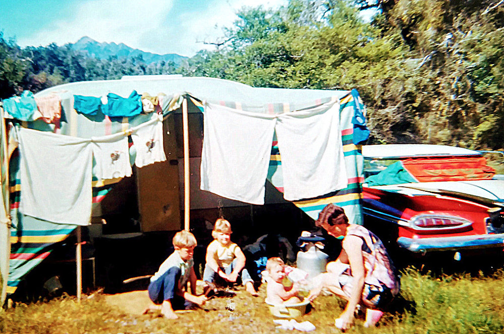 David, Sharon, Jenny & Marcia Gibbons - Caravan camping , Styx River, Hokitika, early 1970's.