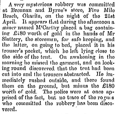 West Coast New Zealand History (12th Oct 2020). Robbery at 5 Mile Beach, Okarito.1866.. In Website West Coast New Zealand History. Retrieved 5th Apr 2026 04:30, from https://westcoast.recollect.co.nz/nodes/view/28564
