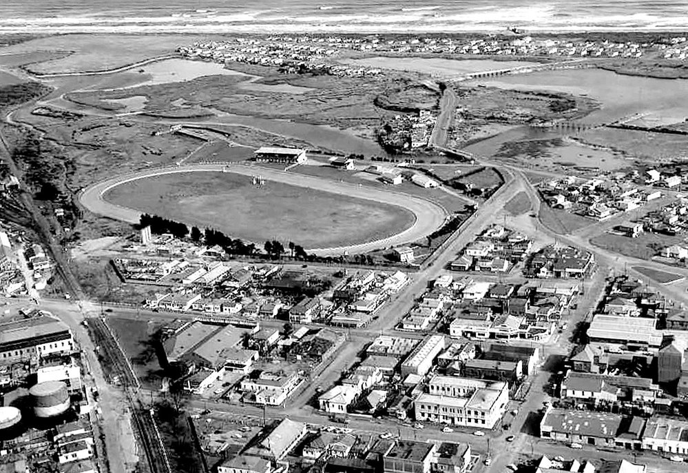 Greymouth aerial 1960, including Gas Works, Police Station and Victoria Park